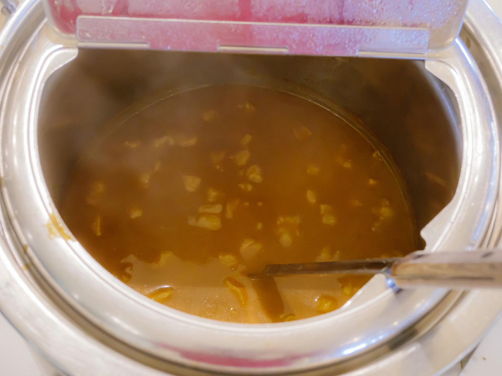サラダバーのカットトマトをブチ込んだかのようにトマトごろごろ。ビスクソース薄めたかのように濃厚なエビ、甲殻類の味わいがファーストアタック。後から辛い。